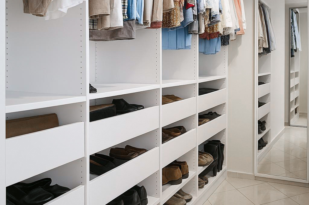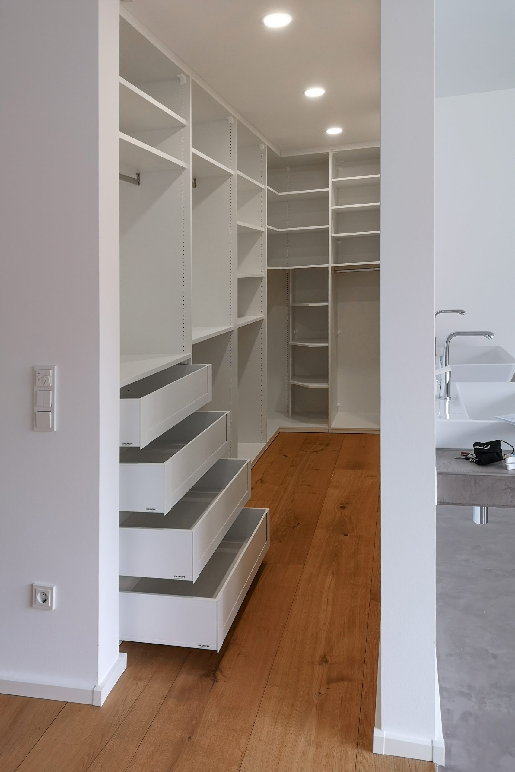 Bei uns ist alles möglich. Ob spezielle Schuhregale, individuell angepasste Kleiderstangen oder ausgeklügelte Schubladensysteme – wir stellen sicher, dass jeder Quadratzentimeter Ihres begehbaren Kleiderschranks perfekt genutzt wird.